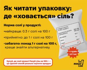 Чим менше солі у продукті — тим краще! Тому читай упаковку на продуктах, де вказана поживна цінність: обирай ті, де менше солі на 100 г!